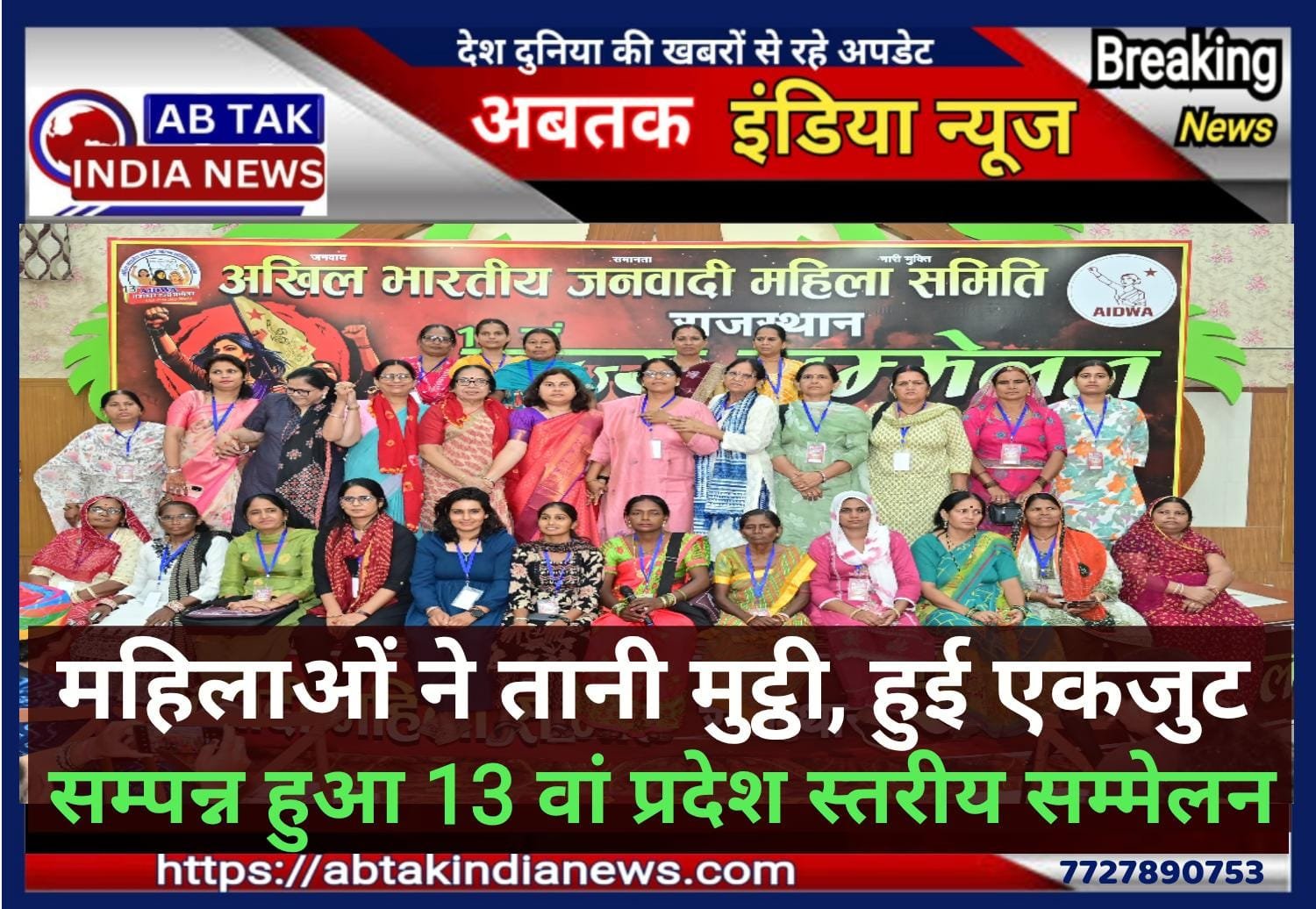 अबतक इंडिया न्यूज 3 अगस्त बीकानेर । अखिल भारतीय जनवादी महिला समिति का 13वां राज्य सम्मेलन बीकानेर में ऐतिहासिक जोश और उमंग के साथ सम्पन्न हुआ। सम्मेलन की शुरुआत प्रदेश महासचिव डॉ. सीमा जैन ने राज्य कमेटी की रिपोर्ट पर हुई 41 सदस्यों द्वारा बहस का जवाब देते हुए की जिसका बाद में जिस पर सर्वसम्मति ने अनुमोदन करते हुए रिपोर्ट पास की। तीन वर्षों के कार्यों की समीक्षा के साथ आगामी तीन वर्षों के लिए नई कार्ययोजना और संघर्ष की दिशा तय की गई।