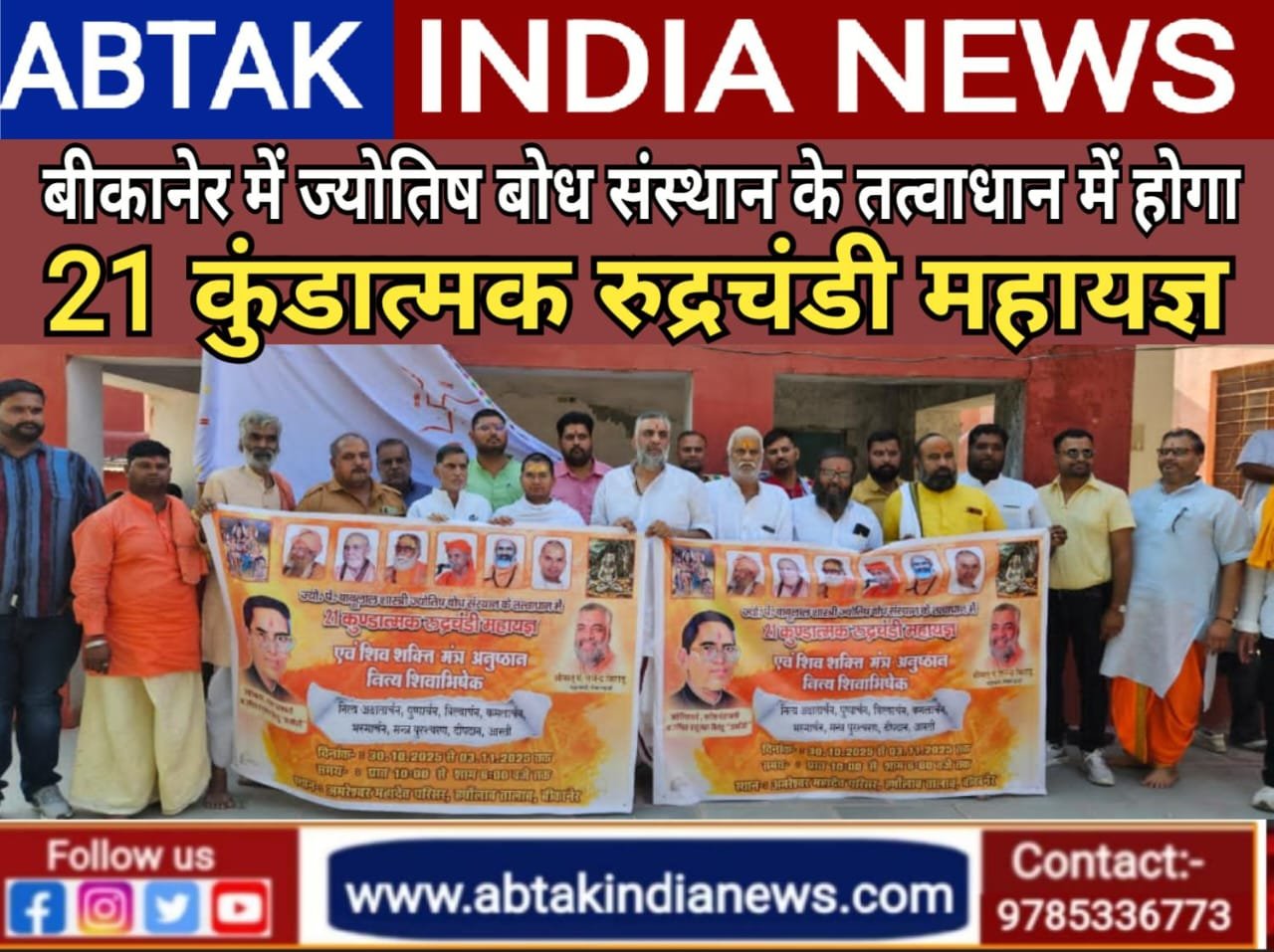 अबतक इंडिया न्यूज बीकानेर 25 अक्टूबर । संस्कृति व संस्कारों की रक्षा के उदेद्श्य से पं बाबूलाल शास्त्री ज्योतिष बोध संस्थान के तत्वाधान में 21 कुण्डात्मक रूद्रचंडी महायज्ञ एवं सवा करोड़ शिवशक्ति मंत्र अनुष्ठान का आयोजन 30 अक्टूबर से 3 नवम्बर तक अमरेश्वर महादेव मंदिर हर्षोल्लाव तालाब परिसर में किया जा रहा है। पत्रकारों को जानकारी देते हुए संस्थान के पंडित राजेन्द्र किराडू ने बताया कि 21 जजमान सम्मलित होंगे। 108 वैदिक पंडित यज्ञ सम्पन्न करवाएंगे। किराडू ने बताया कि रूद्रचंडी महायज्ञ में 11 यजमान प्रवासी बीकानेरी होंगे। जो मुंबई,दिल्ली,सूरत सहित अनेक स्थानों से आ रहे है। वहीं शेष यजमान जिले के होंगे। इसके अलावा भी कोई भी धार्मिक अनुयायी भी यज्ञ में आहूति दे सकेगा।
