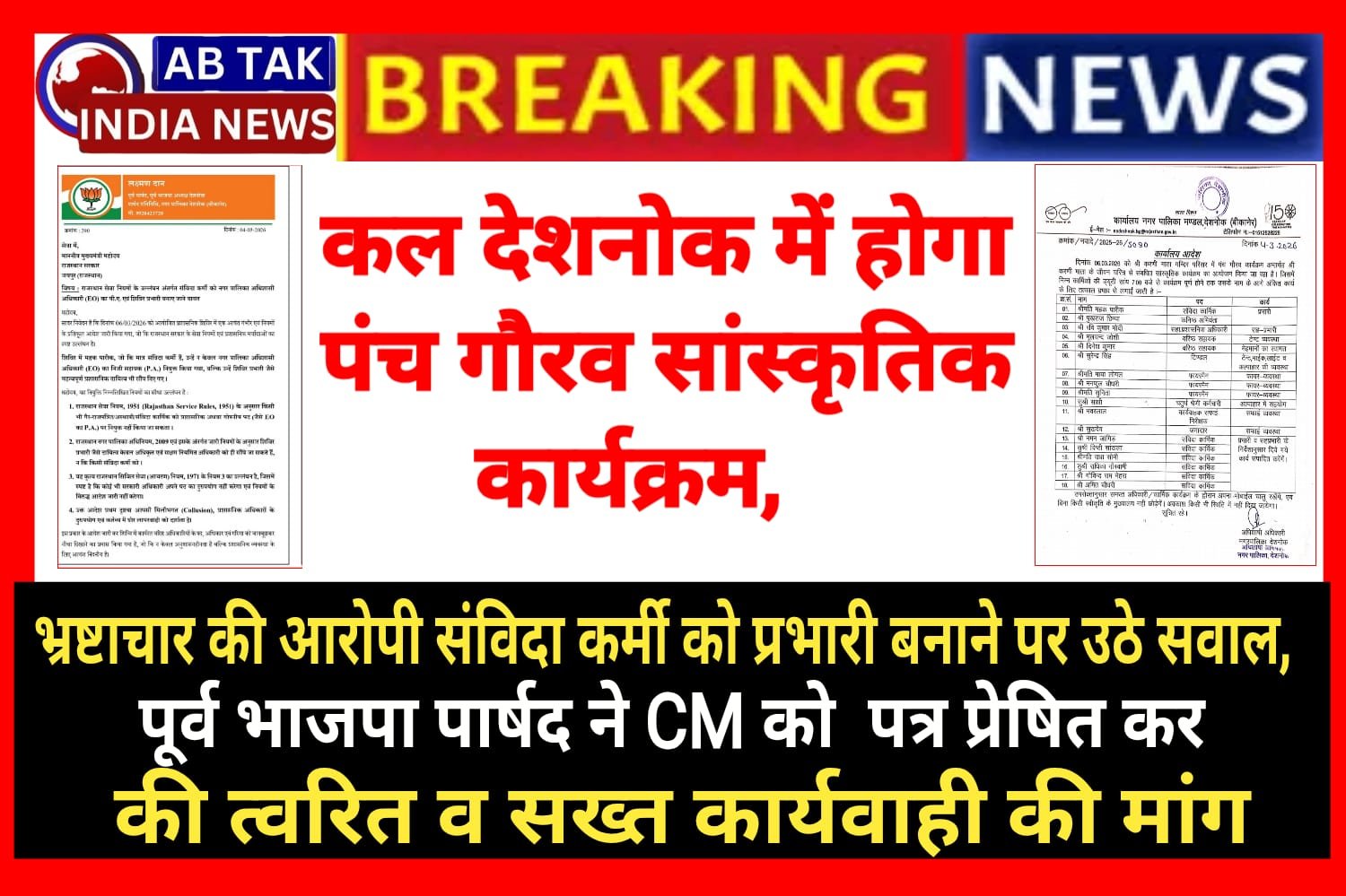 राजस्थान सरकार के इस ऐतिहासिक कार्यक्रम को लेकर देशनोक पालिका ईओ रविंद्र सिंह द्वारा स्थायी वरिष्ठ अधिकारी व कार्मिकों पर संविदा कर्मियों को तवज्जो देने पर पूर्व भाजपा पार्षद लक्ष्मण दान ने गंभीर सवाल उठाए हैं।खासकर पीएम आवास योजना की सीएलटीसी कर्मी पारीक महक को लेकर।पारीक पर पीएम आवास योजना में भ्रष्टाचार के आरोप हैं जिसे लेकर तत्कालीन ईओ ने कारण बताओ नोटिस भी जारी किया था।पूर्व पालिका उपाध्यक्षा ने भी पीएम आवास योजना के तहत किस्त के बदले रिश्वत मांगने का आरोप लगाया था । पूर्व पार्षद ने विभिन्न राजस्थान नगरपालिका अधिनियमों का हवाला देते हुए सूबे के मुख्यमंत्री को पत्र लिखकर त्वरित उचित आवश्यक जांच करवाकर दोषियों के खिलाफ कार्यवाही की मांग की हैं।