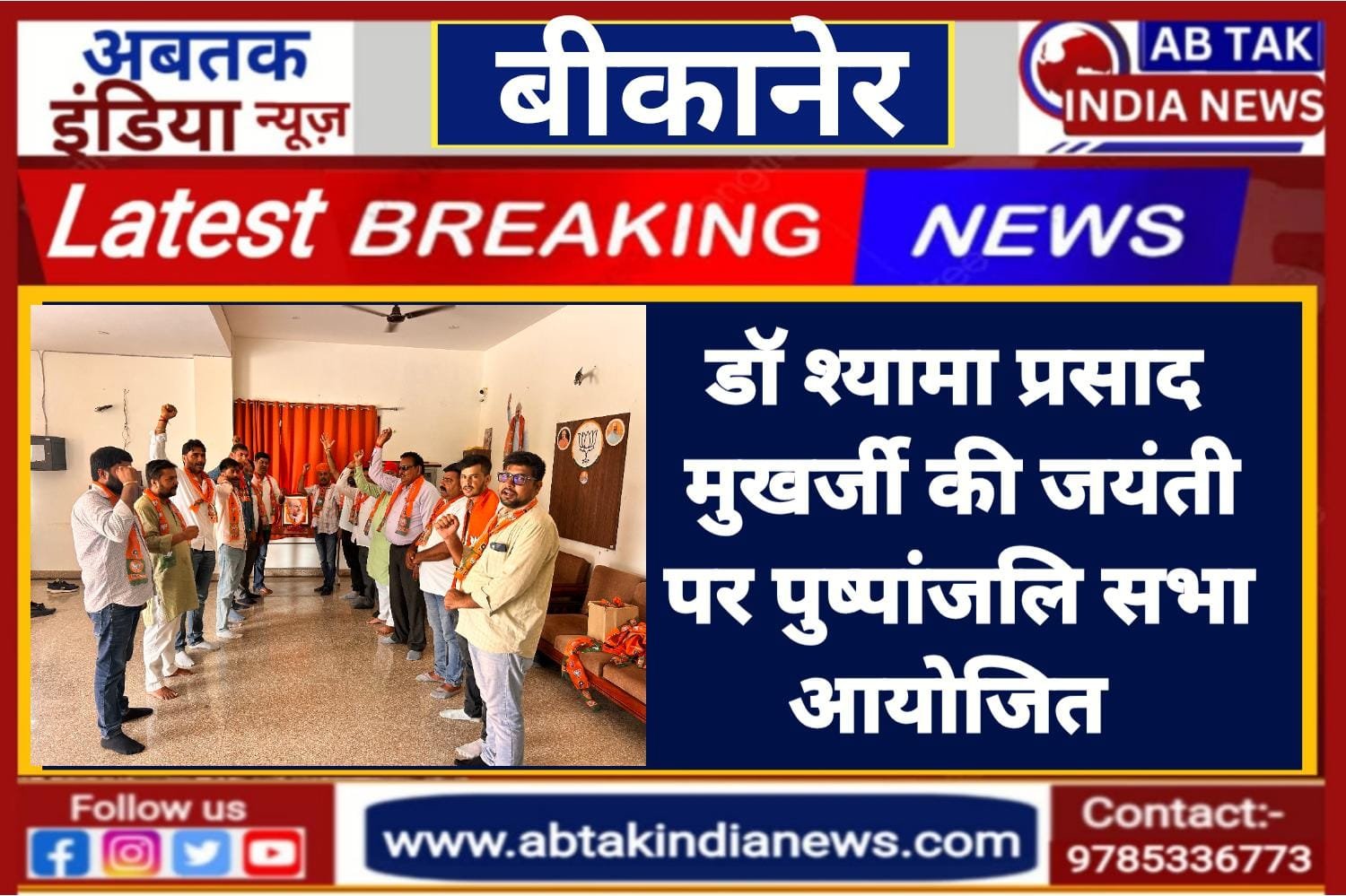 अबतक इंडिया न्यूज 6 जुलाई बीकानेर। जनसंघ के सस्थापक सदस्य रहे डॉ. श्यामाप्रसाद मुखर्जी की जयंती पर आज बूथ संख्या 231 के बीछवाल में भाजपा जिलाध्यक्ष श्याम पचारिया की अध्यक्षता में पुष्पांजलि सभा का कार्यक्रम रखा गया जिसमें जिला मंत्री देवीलाल मेघवाल,मण्डल अध्यक्ष तौलाराम कुकणा, दिलीप सिंह आडसर पवन कुमार स्वामी भवानी पाईवाल जगदीश सुथार मण्डल महामंत्री लक्ष्मण गुरिया मनदीप सोढी, महेंद्र ढाका निशांत गौड़ विजय कुकणा बुथ अध्यक्ष अनिल उपाध्याय सहित भाजपा कार्यकर्ताओ ने उनके चित्र पर पुष्प अर्पण कर पुष्पांजलि दी।