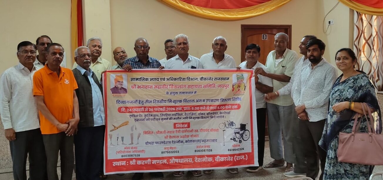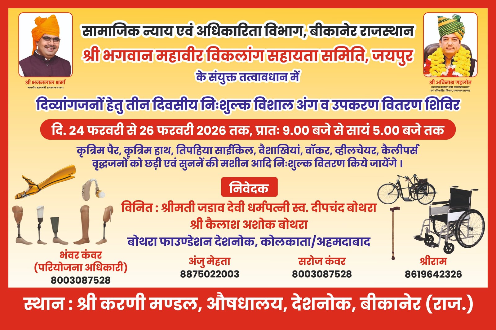 अबतक इंडिया न्यूज 23 फरवरी देशनोक । सोमवार को श्री करणी मंडल औषधालय भवन में निःशक्तजन की सेवार्थ देशनोक में मंगलवार से आरंभ होने वाले तीन दिवसीय निःशुल्क विशाल शिविर के पोस्टर का विमोचन किया गया। यह विशाल शिविर सामाजिक न्याय व अधिकारिता विभाग बीकानेर ,श्री महावीर विकलांग सहायता समिति जयपुर व बोथरा फाउंडेशन देशनोक (कोलकाता ) के संयुक्त तत्वाधान में 24 ,25 व 26 फरवरी को देशनोक स्थित श्री करणी मंडल औषधालय में आयोजित किया जायेगा।