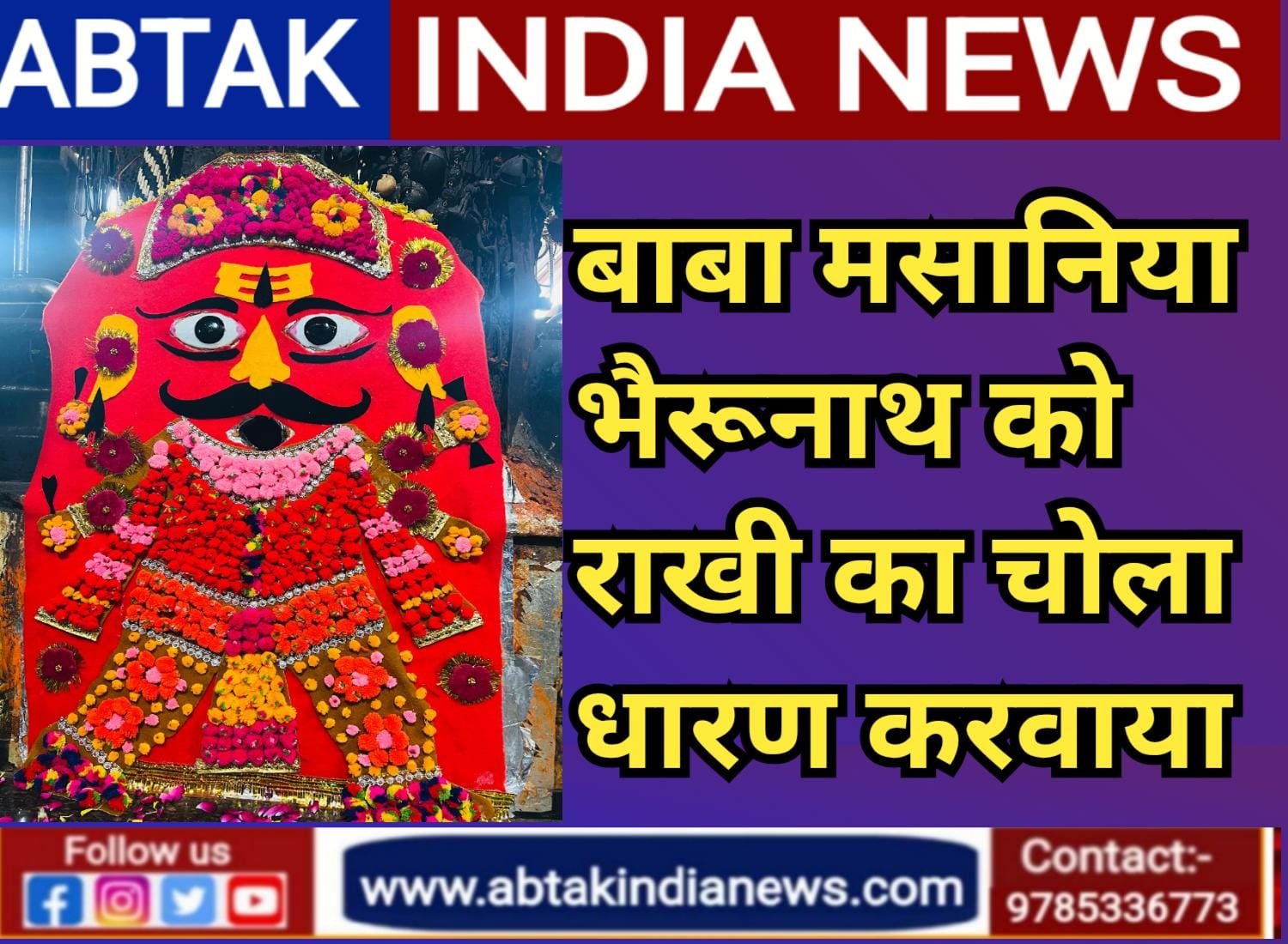 अबतक इंडिया न्यूज 8 अगस्त भीलवाड़ा।शहर के पंचमुखी मोक्षधाम में स्थित श्री मसानिया भैरुनाथ मंदिर में रक्षाबंधन के पर्व पर बाबा मसानिया भैरुनाथ को कोलकत्ता, बिहार व बनारस से लाई गई रंग बिरंगी राखियो का चोला धारण करवाया गया, मंदिर परिसर में विशेष श्रृंगार किया गया। मंदिर के युवा अध्यक्ष रवि कुमार सोलंकी ने बताया कि बाबा का श्रृंगार करने में दीपक सोनी, अवनीत सिंह छाबड़ा, पूरण नाथ अभिषेक सोलंकी सहित कई श्रद्धालुओं का सहयोग रहा।कल दिनांक 9 अगस्त को रक्षाबंधन पर्व पर सायंकालीन विशेष आरती की जाएगी, बाबा को खीर का भोग लगाया जाएगा, मंदिर के पुजारी संतोष कुमार खटीक ने सभी श्रद्धालुओं से अधिक से अधिक संख्या में कार्यक्रम में भाग लेने की अपील की।