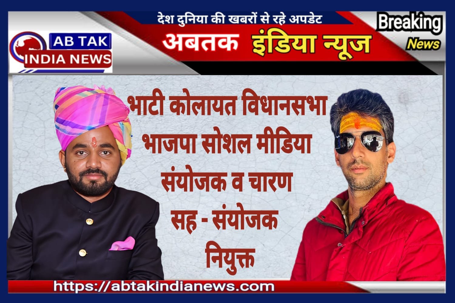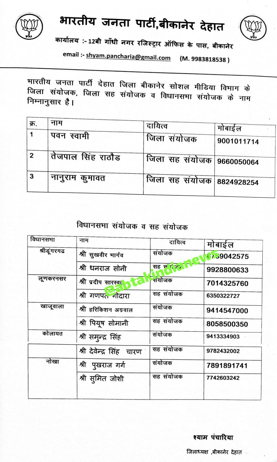 अबतक इंडिया न्यूज कोलायत 8 दिसंबर । भाजपा बीकानेर जिला देहात ने सोमवार को सोशल मीडिया विभाग के लिए जिला व विधानसभाओं के लिए संयोजक व सह-संयोजकों की नियुक्ति की है। पवन स्वामी को जिला संयोजक नियुक्त किया गया है।इसी कड़ी में कोलायत विधानसभा के लिए समुन्द्र सिंह भाटी को संयोजक व देवेंद्र सिंह चारण को सह-संयोजक नियुक्त किया गया है।भाटी व चारण ने कोलायत विधायक अंशुमान सिंह भाटी का आभार जताया है।सियासी तौर पर दोनों ही विधायक भाटी के विश्वस्त सिपहसालार के रूप में जाने जाते हैं।