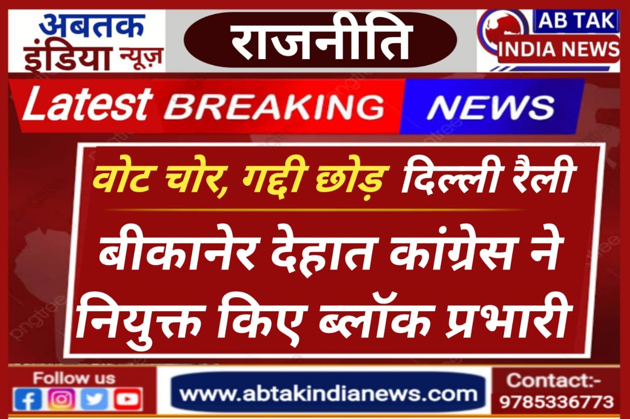 अबतक इंडिया न्यूज 8 दिसंबर बीकानेर । अखिल भारतीय कांग्रेस कमेटी, नई दिल्ली एवं राजस्थान प्रदेश कांग्रेस कमेटी के निर्देशानुसार वोट चोरी रोकने के महाअभियान एवं ‘‘वोट चोर-गद्दी छोड़’’ अभियान को लेकर आगामी 14 दिसम्बर को दिल्ली में प्रस्तावित महारैली की तैयारी हेतु जिला कांग्रेस कमेटी देहात, जिलाध्यक्ष बिशनाराम सियाग कि अनुमति से जिला संगठन महामंत्री मार्शल प्रहलादसिंह ने निम्नांकित पदाधिकारीयों को उनके नाम के आगे अंकित ब्लॉक क्षेत्र का प्रभारी नियुक्त किया हैं।