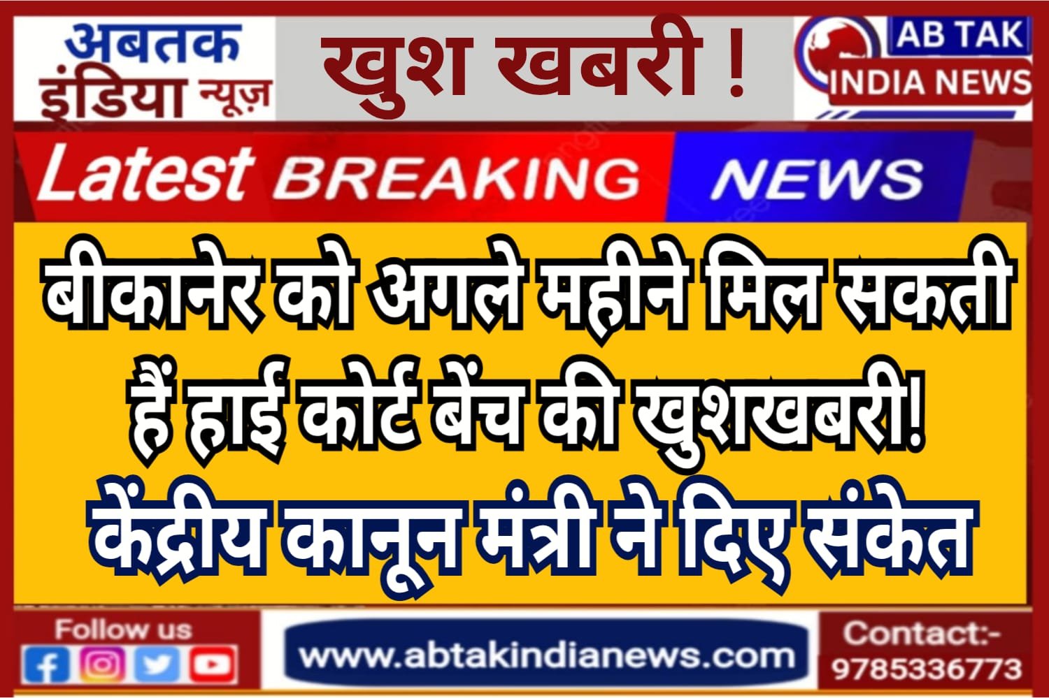 अबतक इंडिया न्यूज 25 अगस्त बीकानेर (केशव आचार्य) केन्द्रीय कानून मंत्री अर्जुन राम मेघवाल ने रविवार को बीकानेर के सर्किट हाउस में पत्रकारों से बातचीत के दौरान बताया कि भारत के मुख्य न्यायाधीश भूषण रामकृष्ण गवई अगले महीने बीकानेर आएंगे। एक पत्रकार द्वारा बीकानेर में हाईकोर्ट की बैंच की स्थापना से जुड़े प्रश्न के जवाब में मेघवाल ने बताया कि मुख्य न्यायाधीश आ रहे हैं, तो कोई ना कोई प्रोग्रेस हुई होगी, तभी आ रहे हैं। उन्होंने यह बात स्वीकार करते हुए कहा भी कि बीकानेर में हाईकोर्ट बैंच स्थापना की दिशा में धरातल पर कुछ काम हुआ है।