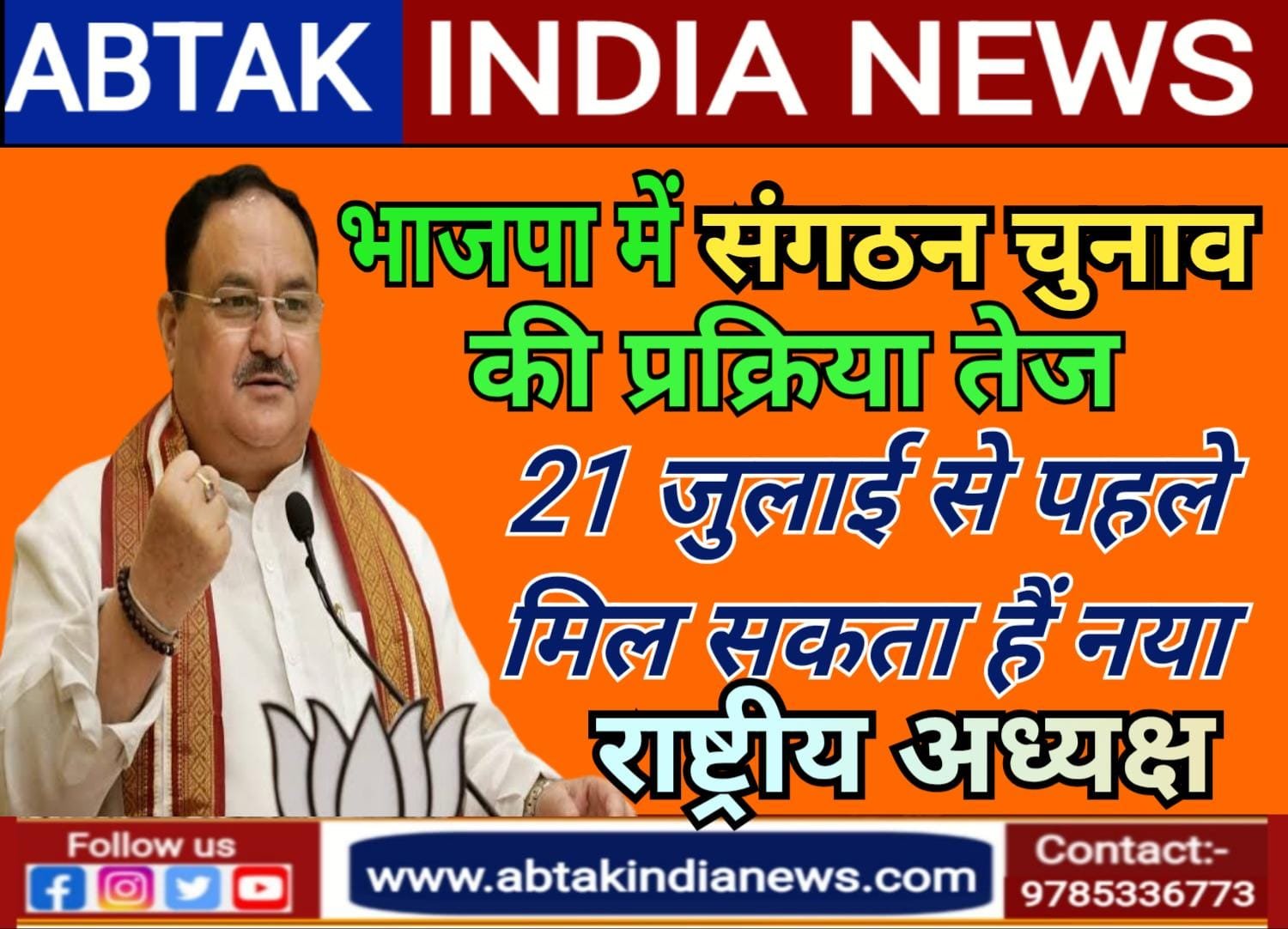 अबतक इंडिया न्यूज 27 जून । भारतीय जनता पार्टी (BJP) में संगठनात्मक चुनाव की प्रक्रिया अब रफ्तार पकड़ चुकी है. पार्टी सूत्रों के मुताबिक, 21 जुलाई से शुरू हो रहे संसद के मानसून सत्र से पहले बीजेपी को नया राष्ट्रीय अध्यक्ष मिल सकता है. इससे पहले प्रदेश स्तर पर संगठन चुनावों की प्रक्रिया पूरी की जा रही है. माना जा रहा है कि पार्टी नेतृत्व अगले एक हफ्ते से दस दिनों के भीतर लगभग 8 से 10 राज्यों में प्रदेश अध्यक्षों के नामों की घोषणा करने की तैयारी में है. इन राज्यों में आंध्र प्रदेश, तेलंगाना, मध्यप्रदेश, उत्तराखंड, ओडिशा, पश्चिम बंगाल, महाराष्ट्र और गुजरात शामिल हैं.