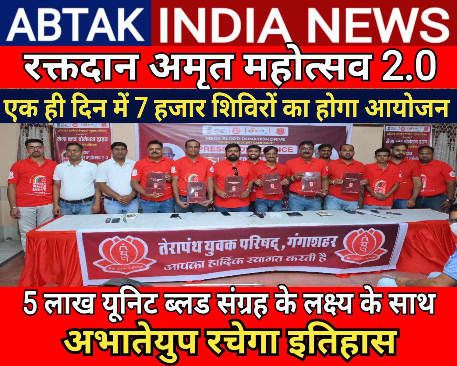 अभातेयुप के राष्ट्रीय अध्यक्ष रमेश डागा ने बताया की 75000 से अधिक कर्मठ, युवा, उत्साही एवं देशभक्ति की भावना से ओत-प्रोत युवाओं और 362 शाखा परिषदों के माध्यम से देश और विदेशों में सबसे बड़े रक्तदान अभियान “मेगा ब्लड डोनेशन ड्राइव’ (एमबीडीडी) के नाम से एक ही दिन में 7000 से अधिक रक्तदान शिविरों के माध्यम से 500000 से अधिक ब्लड यूनिट संग्रह के लक्ष्य हेतु सक्रिय है एवं नया कीर्तिमान रचने जा रही है।”
