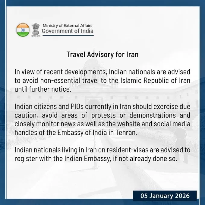 अबतक इंडिया न्यूज 5 जनवरी दिल्ली । भारत सरकार ने ईरान को लेकर ट्रैवेल एडवाइजरी जारी की है. सरकार ने कहा है कि अगर जरूरत हो तभी ईरान की यात्रा करेंगे वरना जाने से परहेज करें. साथ ही साथ वहां रह रहे भारतीयों से उन उन इलाकों में जाने से परहेज करने की नसीहत दी गई है.