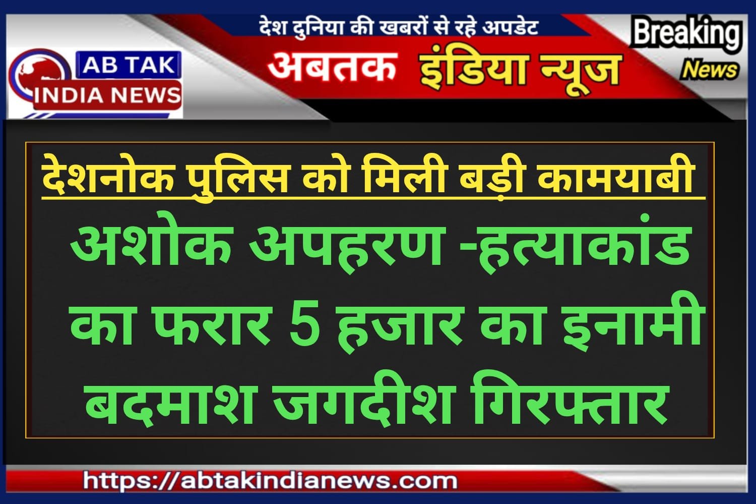 अबतक इंडिया न्यूज देशनोक 18 दिसंबर । अशोक अपहरण-हत्याकांड में देशनोक पुलिस को बड़ी सफलता मिली है।एसएचओ सुमन शेखावत ने बताया कि पिछले महीने 29 नवंबर को रात्रि 9.15 बजे अशोक जाट का अपहरण कर हत्या करनेवाले फरार नामजद आरोपियों में से मुख्य आरोपी जगदीश जाट निवासी पांचू को देशनोक पुलिस की विशेष टीम ने दबिश देकर हरियाणा के गुड़गांव से गिरफ्तार किया है।अपराध की गंभीरता को देखते हुए बीकानेर एसपी कावेंद्र सिंह सागर ने जगदीश को पांच हजार का इनामी बदमाश घोषित किया था।पुलिस आरोपी से गहनता से अनुसंधान कर रही है। इस बड़ी कार्यवाही में सीआई सुमन शेखावत ,कांस्टेबल दिनेश व पुरषोत्तम की अहम भूमिका रही।