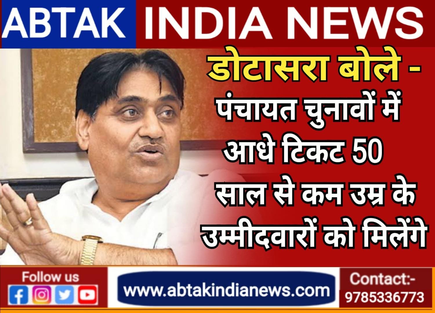 अबतक इंडिया न्यूज 16 जून । राजस्थान पीसीसी अध्यक्ष गोविन्द डोटासरा ने प्रेस कॉन्फ्रेंस में बड़ा बयान दिया है. उन्होंने कहा कि निकाय और पंचायत चुनावों में संगठन के पदाधिकारियों की भूमिका अहम रहेगी और टिकट वितरण में उनकी भागीदारी सुनिश्चित की जाएगी. डोटासरा ने यह भी स्पष्ट किया कि 50 फीसदी टिकट 50 वर्ष से कम आयु वर्ग के उम्मीदवारों को दिए जाएंगे, ताकि युवा नेतृत्व को आगे लाया जा सके.