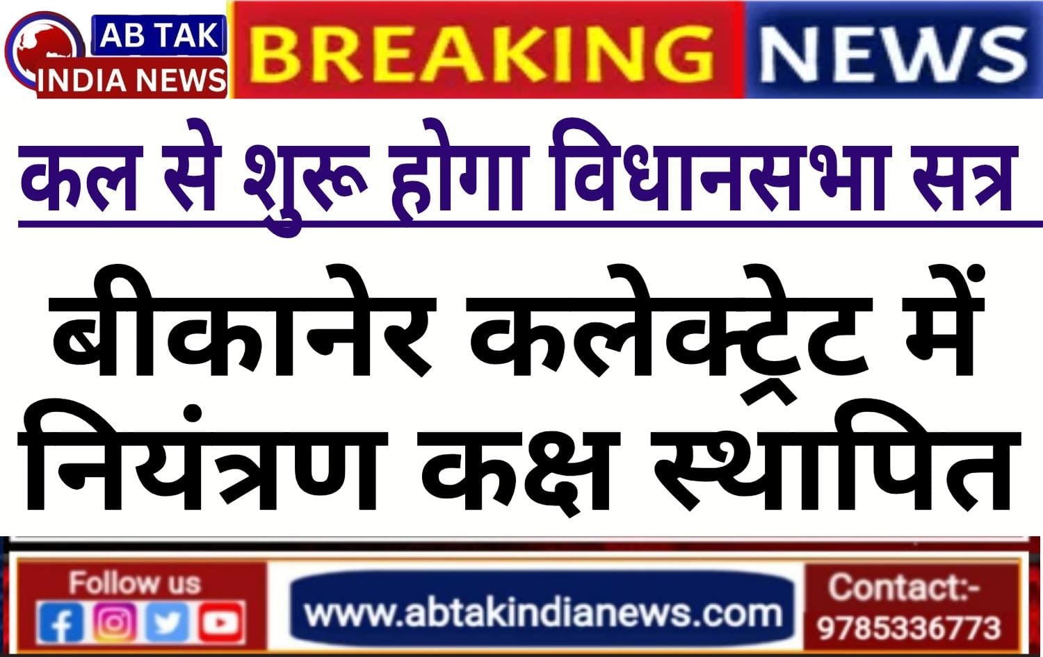 अबतक इंडिया न्यूज बीकानेर, 27 जनवरी। सोलहवीं विधानसभा का पंचम सत्र 28 जनवरी को आरम्भ होगा। इस दौरान प्राप्त होने वाले प्रश्नों, ध्यानाकर्षण विशेष उल्लेख, प्रस्तावों आदि का जवाब समय पर भिजवाने के लिए 28 जनवरी से जिला कलक्टर कार्यालय के कमरा नम्बर 5 में नियंत्रण कक्ष की स्थापना की जाएगी। नियंत्रण कक्ष के दूरभाष नम्बर 0151-2226031 हैं।