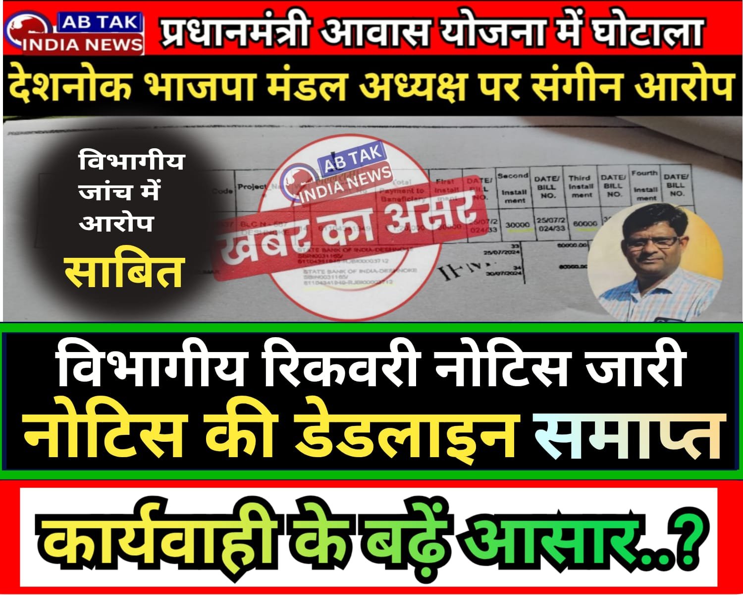 विभागीय जांच रिपोर्ट के बाद मामले में लिप्त देशनोक भाजपा मंडल अध्यक्ष पवन कुमार पंचारिया जो पार्षद भी है को देशनोक पालिका प्रशासन द्वारा रिकवरी नोटिस जारी किया गया।नोटिस में पांच दिनों के भीतर अवैध तरीके से पीएम आवास योजना की हड़पी गई राशि एक लाख 20 हजार पालिका कार्यालय में जमा करवाने के लिए निर्देशित किया गया।निर्धारित समय मे राशि जमा नहीं कराने की स्थिति में कानूनी कार्यवाही की चेतावनी दी गई है। नोटिस में निर्धारित समय सीमा पार हो चुकी है, लेकिन अवैध रूप से हड़पी गई राशि जमा नहीं करवाई गई हैं। ऐसे में अब घोटाले में लिप्त पवन कुमार पंचारिया के खिलाफ विभागीय स्तर पर कानूनी कार्यवाही की राह का विकल्प खुल गया हैं।