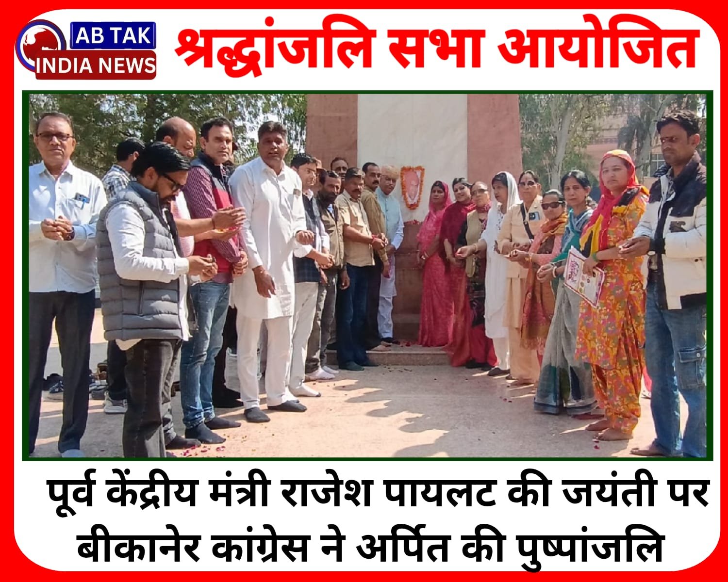 अबतक इंडिया न्यूज 10 फरवरी बीकानेर । देश के महान नेता, पूर्व केंद्रीय मंत्री स्वर्गीय राजेश पायलट की जयन्ति के अवसर पर गांधी पार्क में श्रद्धांजलि सभा का आयोजन किया गया। कांग्रेसजनों ने स्व. राजेश पायलट के तैलचित्र पर माल्यार्पण व पुष्पांजलि अर्पित कर उनका स्मरण करते हुए नमन किया और दो मिनट का मौन रखकर श्रद्धांजलि दी, साथ ही राजेश पायलेट अमर रहे के नारे लगाये।