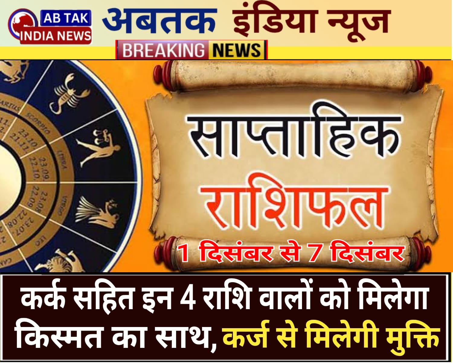 अबतक इंडिया न्यूज 30 नवंबर साप्ताहिक राशिफल (1 से 7 दिसंबर 2025): इस हफ्ते धनु, मेष, वृश्चिक, मिथुन और मीन राशियां तेज प्रगति में आगे बढ़ेंगी. यह सप्ताह दिसंबर की शुरुआत को ऊर्जावान और परिवर्तनकारी बनाएगा. मंगल का धनु राशि में प्रवेश ऊर्जा को कर्म, स्पष्टता और विस्तार की ओर ले जाएगा. वृश्चिक राशि में स्थित शुक्र भावनाओं को गहरा और गंभीर बनाए रखेंगे. सप्ताहभर चंद्रमा का मेष, वृषभ, मिथुन और कर्क राशि में गोचर भावनात्मक बदलाव और समझ को बढ़ाएगा.वक्री बृहस्पति अंदरूनी विकास, आत्मविश्लेषण और समझदारी से निर्णय लेने में मदद करेगा. वृश्चिक राशि में शुक्र भावनाओं की गहराई और आत्मिक जुड़ाव बनाए रखेंगे. मंगल और बुध के राशि परिवर्तन से संवाद, निर्णय और कार्यों में तेजी आएगी. सप्ताह का अंत कर्क राशि में चंद्रमा के प्रवेश से भावनात्मक स्थिरता और घर-परिवार से जुड़ाव का एहसास कराएगा.