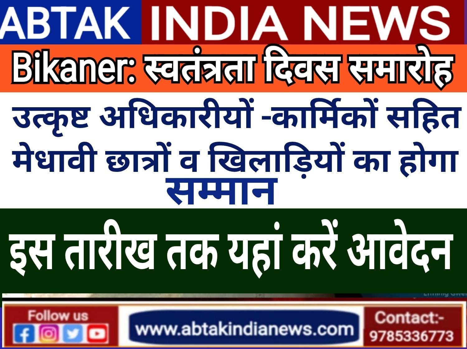 अबतक इंडिया न्यूज बीकानेर, 4 अगस्त। राजकीय सेवाओं में उल्लेखनीय योगदान देने वाले स्थायी राजकीय अधिकारियों एवं कर्मचारियों तथा उत्कृष्ट उपलब्धि प्राप्त करने वाले मेधावी विद्यार्थियों तथा अंतरराष्ट्रीय व राष्ट्रीय स्तर की खेलकूद प्रतियोगिताओं में प्रथम, द्वितीय एवं तृतीय स्थान प्राप्त करने वाले खिलाड़ियों को स्वतंत्रता दिवस के मुख्य समारोह के दौरान सम्मानित किया जाएगा।
