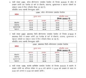 7. गाडी संख्या 22997, झालावाड सिटी-श्रीगंगानगर एक्सप्रेस रेलसेवा जो दिनांक 27.08.25 से झालावाड सिटी से प्रस्थान करेगी उस रेलसेवा के मार्ग के बीकानेर, लालगढ, लूनकरनसर व महाजन स्टेशनों पर संचालन समय में परिवर्तन किया जा रहा है।