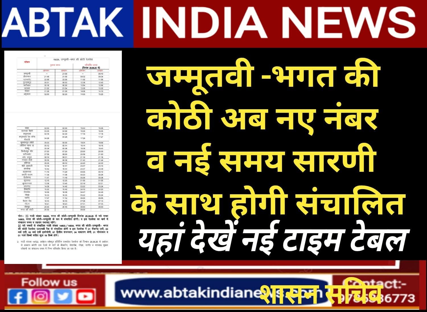 नोटः- (1) गाडी संख्या 19225, भगत की कोठी-जम्मूतवी दिनांक 25.08.25 से नये नम्बर 14803, भगत की कोठी-जम्मूतवी के रूप में संचालित होगी। व इस रेलसेवा का मार्ग में संचालन समय व ठहराव यथावत् रहेगे।