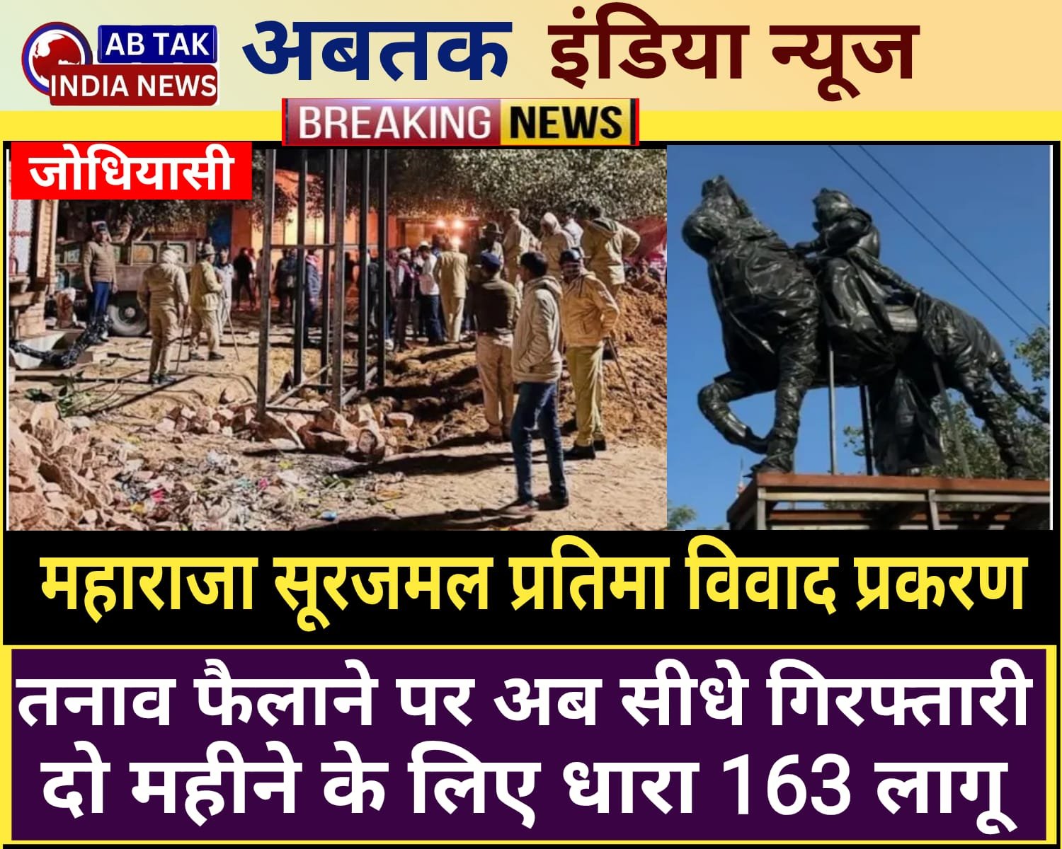 अबतक इंडिया न्यूज नागौर 19 नवंबर । रात 1 बजे चोरी-छिपे महाराजा सूरजमल की प्रतिमा लगाने से हुए विवाद के 24 घंटे बाद भी नागौर के जोधियासी गांव में माहौल तनावपूर्ण है. शांति भंग की आशंका के मद्देनजर SDM ने अगले 2 महीने के लिए इलाके में धारा 163 लागू कर दी है. इसके चलते अब गांव में 5 से अधिक लोगों के एक जगह इकट्ठा होने पर रोक रहेगी. इसके अलावा बिना अनुमति जुलूस निकालने, सभा करने या कोई भी भीड़-भाड़ वाली गतिविधि आयोजित नहीं कर सकेंगे. न ही कोई लाउडस्पीकर का उपयोग कर पाएगा.