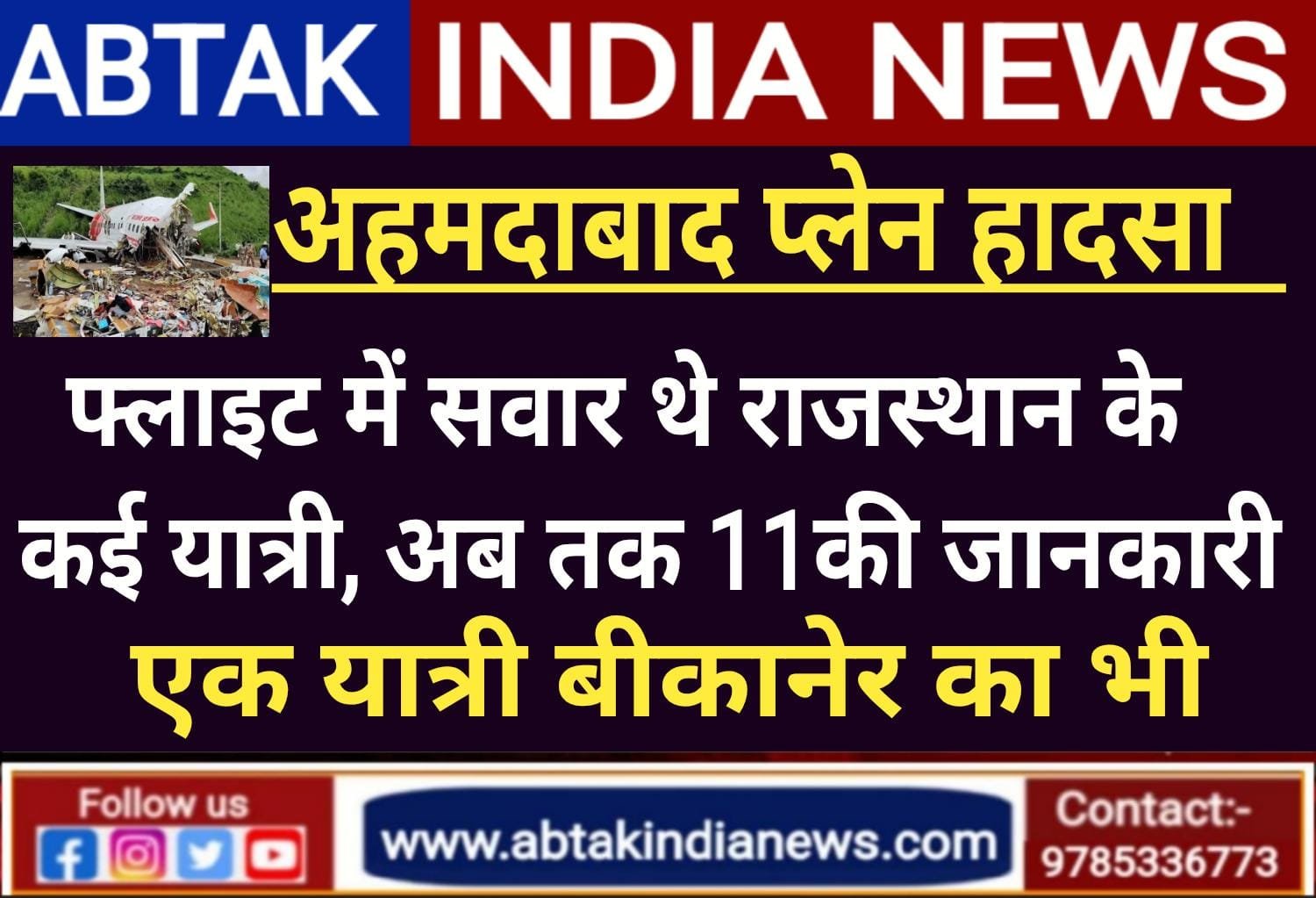 अबतक इंडिया न्यूज 12 जून । अहमदाबाद एयर इंडिया की फ्लाइट में सवार यात्रियों में अब तक राजस्थान के 11 यात्रियों की जानकारी मिली है. हालांकि यह आंकड़ा और बढ़ सकता है.