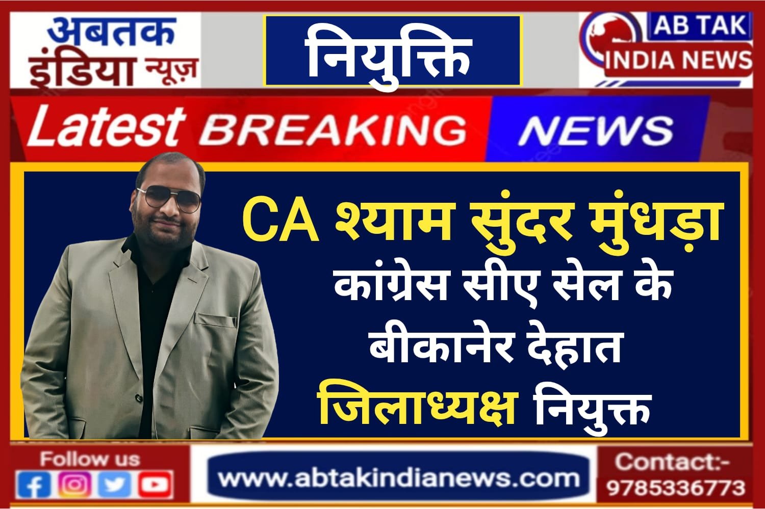 अबतक इंडिया न्यूज 24 जून बीकानेर । राजस्थान प्रदेश कांग्रेस कमेटी की चार्टर्ड अकाउंटेंट सेल द्वारा आज जिलाध्यक्षों की घोषणा की गई है।सेल के प्रदेश अध्यक्ष सी ए नितिन व्यास ने बीकानेर देहात जिलाध्यक्ष पद पर देशनोक निवासी सी ए श्याम सुंदर मूंधड़ा की नियुक्ति की है।