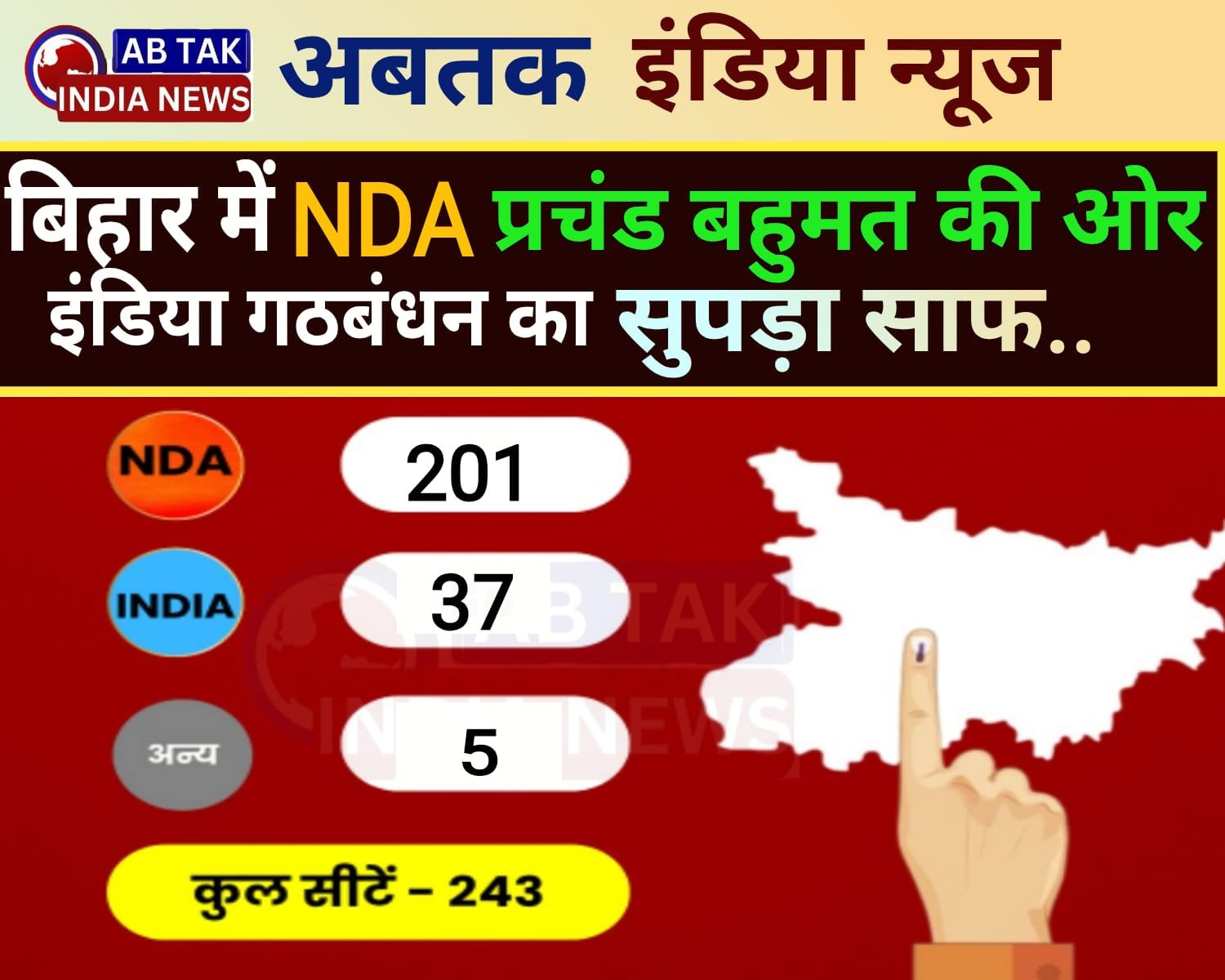 अबतक इंडिया न्यूज पटना 14 नवंबर । 243 की विधानसभा में 200 सीटें! बिहार में NDA ऐसा छप्परफाड़ जीतेगा किसी ने सोचा न था. रुझान अगर नतीजों में बदलते हैं तो NDA को 2010 के बाद इतनी बड़ी जीत मिल रही है. ऐसी सूनामी चली है कि महागठबंधन का सूपड़ा साफ हो गया है. आखिर ऐसा हुआ क्या? जानिए इन सीटों का पूरा निचोड़…