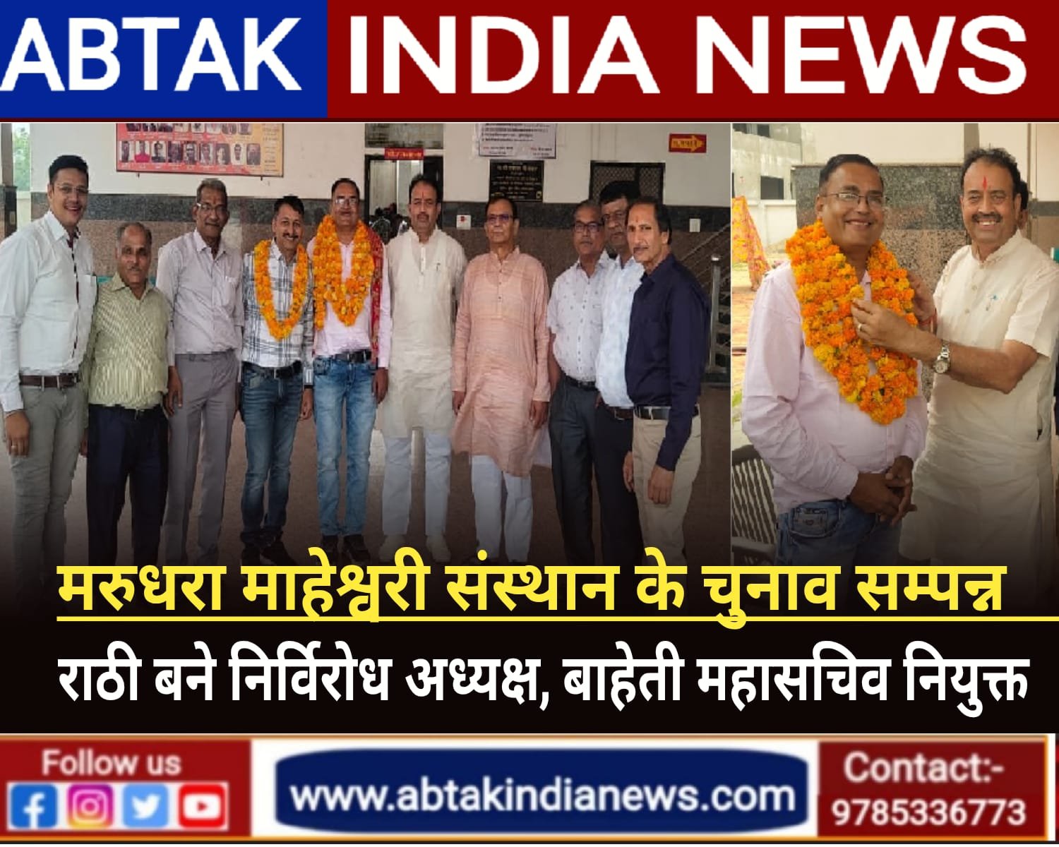 अबतक इंडिया न्यूज 29 अक्टूबर भीलवाडा। मरुधरा माहेश्वरी संस्थान भीलवाड़ा का दीपावली स्नेह मिलन समारोह आजाद नगर माहेश्वरी भवन में सम्पन हुआ। इस अवसर पर संस्थान के चुनाव कराये गए चुनाव अधिकारी राजेंद्र दम्माणी, महेश जाजू ने सर्व सम्मती से चुनाव कराये। दिनेश राठी निर्विरोध अध्यक्ष चुने गये। राठी ने अपनी कार्यकारणी में नारायण बाहेती को महासचिव पद पर नियुक्त किया, नये अध्यक्ष का सभी सदस्यों ने स्वागत किया, अध्यक्ष राठी ने कहा समाज के सभी लोगों को साथ लेकर चलूँगा जो समाज हित में कार्य होंगे उनको ज्यादा से ज्यादा करने का प्रयास करूँगा। वर्तमान अध्यक्ष शान्ति प्रकाश मोहता ने नये अध्यक्ष दिनेश राठी को कार्यभार सोपा और उनके उज्ज्वल भविष्य की कामना की और समाज में उच्चतम अंक लाने वाले बच्चो को सम्मानित किया गया। इस अवसर पर राधा किशन सोमानी, राधेश्याम सोमानी, दामोदर सिंगी, शान्ति प्रकाश मोहता, राजेश बाहेती, राजेश बिहानी, महादेव बाहेती, विनय मूंदड़ा, हर्ष राठी सहित कई सदस्य उपस्थित थे। अंत में महासचिव नारायण बाहेती ने सभी का आभार व्यक्त किया।