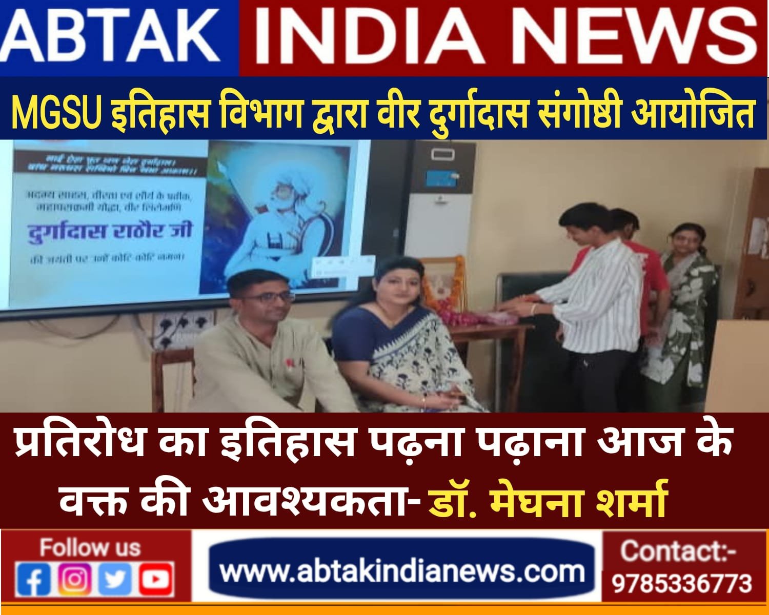 अबतक इंडिया न्यूज 13 अगस्त बीकानेर । महाराजा गंगा सिंह विश्वविद्यालय के इतिहास विभाग में वीर दुर्गादास राठौड़ की जयंती हर्षोल्लास के साथ मनाई गई। सर्वप्रथम विभाग के सदस्यों द्वारा दुर्गादास राठौड़ की प्रतिमा के समक्ष दीप प्रज्वलित कर पुष्पांजलि अर्पित की गई। कार्यक्रम की अध्यक्षता करते हुए इतिहास विभाग की विभागाध्यक्ष डाॅ. मेघना शर्मा ने कहा कि राष्ट्रीय शिक्षा नीति के तहत मातृभाषा उन्नयन, स्थानीय शासकों द्वारा बाहरी शक्तियों के प्रति प्रतिरोध का इतिहास पढ़ना पढ़ाना आज वक्त की ज़रूरत है और भारतीय जान परंपरा के स्रोतों का अध्ययन हमारे वीर शासकों की जीवनियां प्रमुखता से प्रस्तुत करती है। कार्यक्रम में विशिष्ट अतिथि डाॅ. प्रभुदान चारण ने बताया कि वीर दुर्गादास का व्यक्तित्व महान गुणों से परिपूर्ण था जिनकी वीरता की कहानियां पढ़कर अनायास ही देशप्रेम का भाव मन में जागता है।कार्यक्रम का संचालन करते हुए अतिथि शिक्षक डाॅ. मुकेश हर्ष द्वारा विषय प्रवर्तन किया गया।