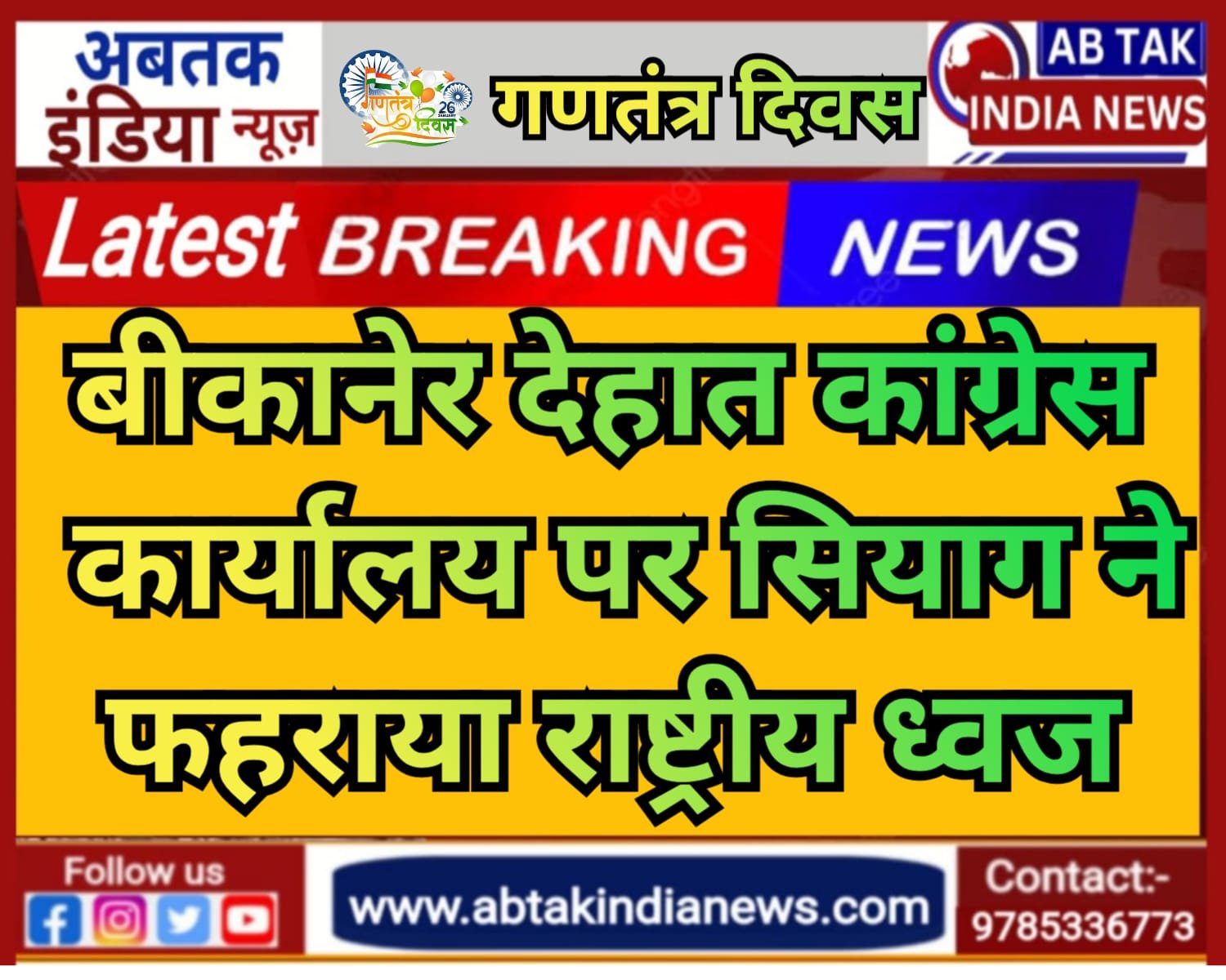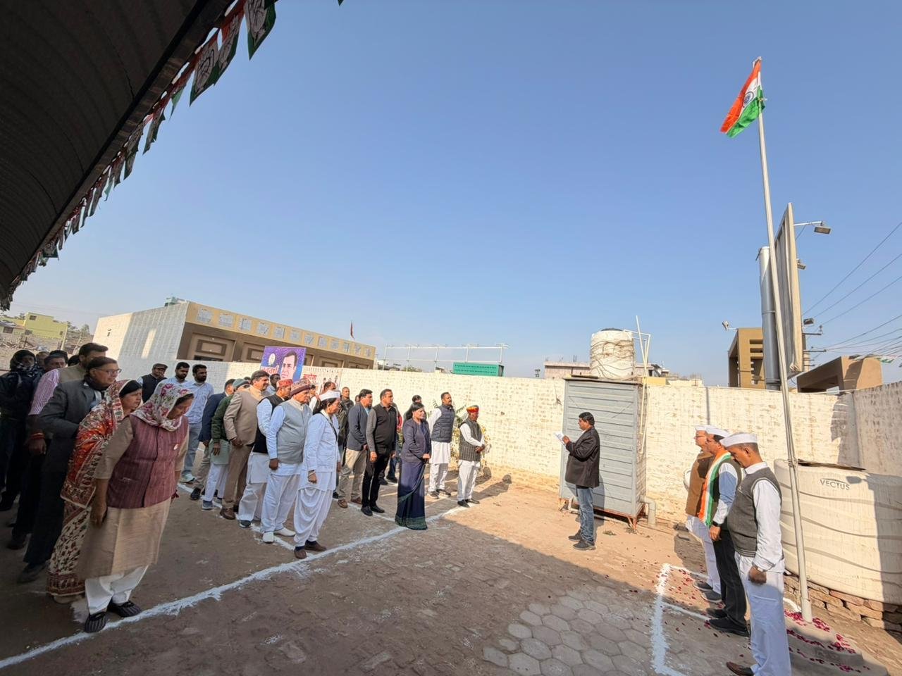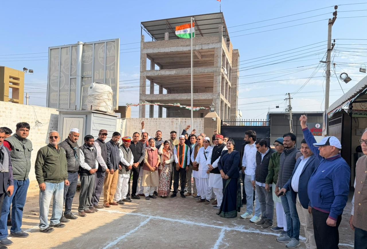 अबतक इंडिया न्यूज 26 जनवरी बीकानेर । जिला कांग्रेस कमेटी देहात, बीकानेर द्वारा सोमवार को भारत के 77वें गणतंत्र दिवस के महान पर्व पर एक भव्य एवं गरिमामय समारोह रानी बाजार स्थित जिला कांग्रेस कमेटी देहात कार्यालय में प्रातः 10ः15 बजे आयोजित हुआ। समारोह में अध्यक्ष बिशनाराम सियाग द्वारा भारतीय राष्ट्रीय ध्वज फहराया गया। ध्वजारोहण के पश्चात उपस्थित कांग्रेस पदाधिकारियों व कार्यकर्ताओं ने राष्ट्रगान के साथ देश की एकता, अखंडता तथा भारतीय संविधान की गरिमा को बनाए रखने का संकल्प लिया तथा देश भक्ति के नारे लगायें।