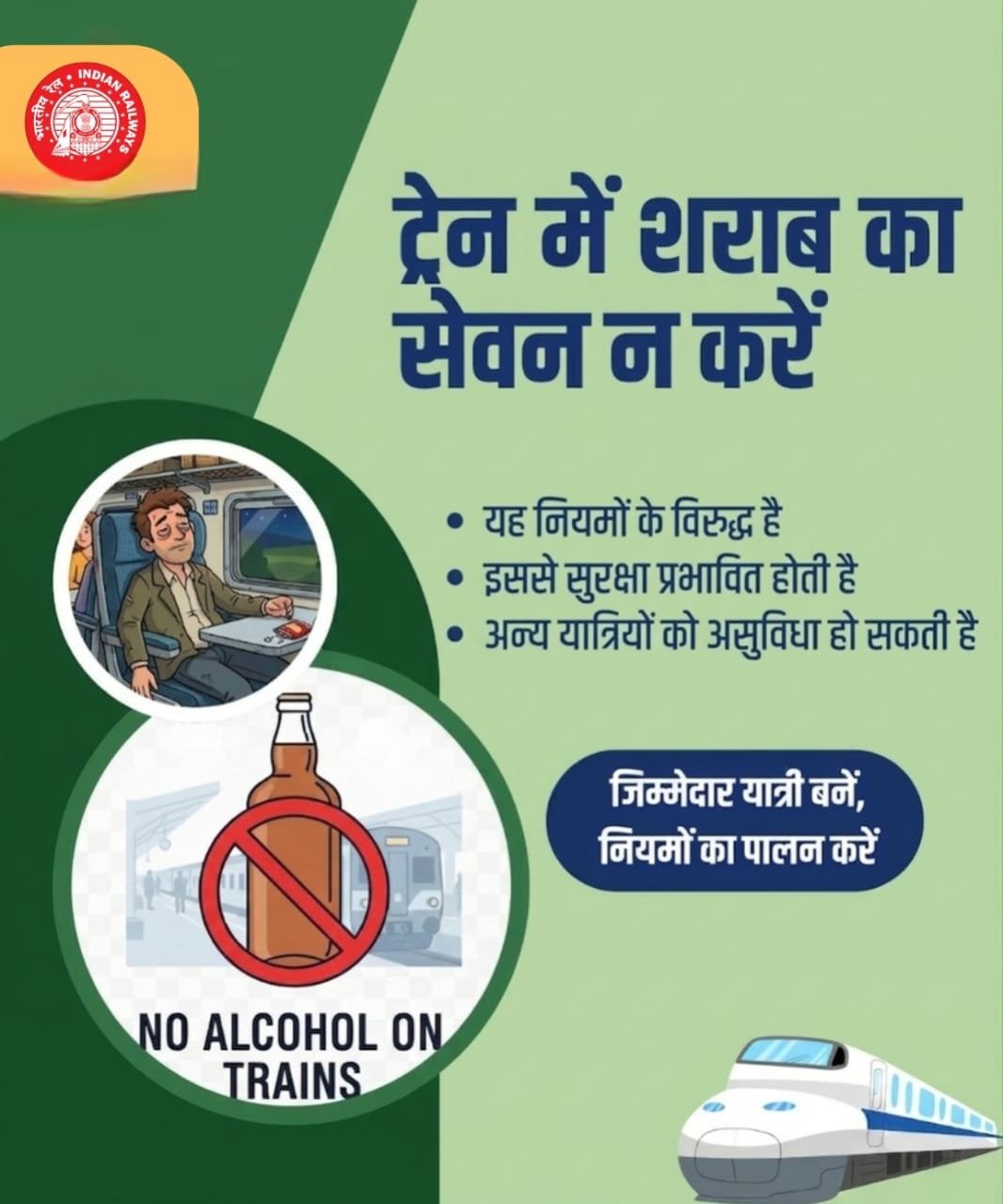 अबतक इंडिया न्यूज 16 मार्च जोधपुर।रेलवे ने दोहराया है कि ट्रेन में यात्रा के दौरान अवैध रूप से शराब लेकर चलना तथा नशे की हालत में अनुशासनहीन व्यवहार करना दंडनीय अपराध है। रेलवे नियमों तथा संबंधित राज्यों के आबकारी कानूनों के अनुसार बिना वैध अनुमति के शराब का परिवहन करना,उसकी अवैध ढुलाई करना या तस्करी करना कानूनन प्रतिबंधित है। ऐसे मामलों में संबंधित व्यक्ति के खिलाफ सख्त कानूनी कार्रवाई की जा सकती है।
