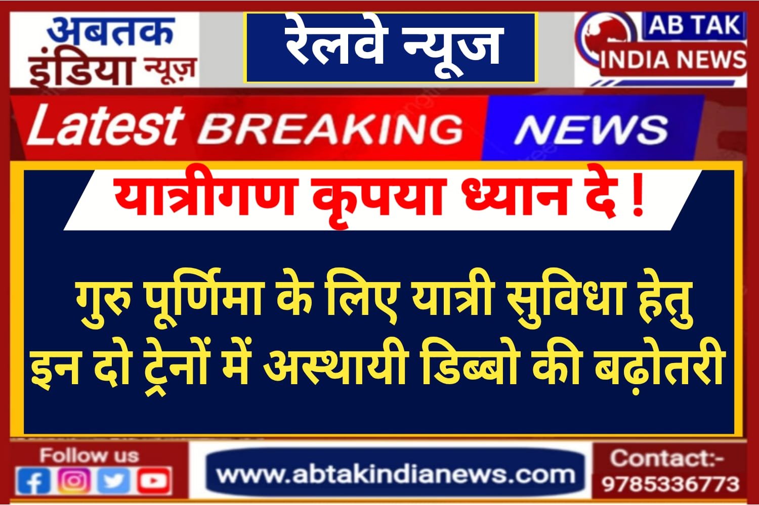 अबतक इंडिया न्यूज जोधपुर, 03 जुलाई। रेलवे द्वारा गोवर्धन परिक्रमा मेला एवं मथुरा में गुरू पुर्णिमा मेले के अवसर पर अतिरिक्त यात्री यातायात को ध्यान में रखते हुए यात्रियों की सुविधा हेतु 02 जोडी रेलसेवाओं में द्वितीय साधारण श्रेणी डिब्बो की अस्थाई बढोतरी की जा रही है। मंडल रेल प्रबंधक अनुराग त्रिपाठी के अनुसार –