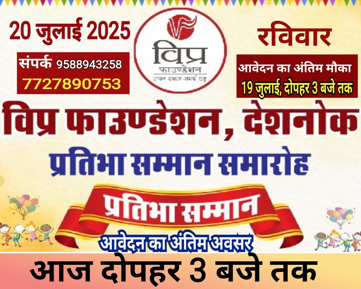 अबतक इंडिया न्यूज देशनोक 19 जुलाई । विप्र फाउंडेशन देशनोक इकाई सामाजिक सरोकार कार्यक्रम के तहत देशनोक ब्राह्मण समाज के होनहार विद्यार्थियों की प्रतिभाओं के सम्मान हेतु प्रतिभा सम्मान समारोह आयोजित करेगा। विफ़ा देशनोक इकाई के अध्यक्ष कैलाश चंद उपाध्याय ने प्रतिभा सम्मान समारोह की जानकारी देते हुए बताया कि सत्र 2024-25 में 10 वीं व 12 वीं बोर्ड परीक्षा में 60 प्रतिशत से ज्यादा अंक प्राप्त करने वाले सभी स्थानीय विप्र समाज के छात्र-छात्राओं को सम्मानित किया जाएगा।साथ ही स्नातक व स्नातकोत्तर परीक्षा में 60 प्रतिशत से अधिक अंक प्राप्त करने वाले विद्यार्थियों को सम्मानित किया जाएगा। प्रतिभा सम्मान समारोह वृंदावन गार्डन कुम्हारों का मोहल्ला देशनोक में आयोजित होगा।