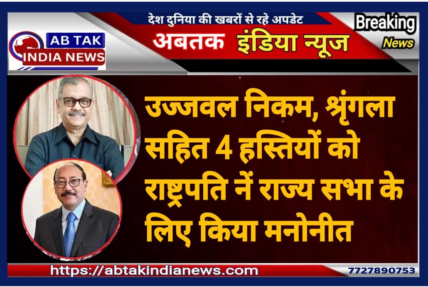 अबतक इंडिया न्यूज 13 जुलाई । देश की जानीमनी चार हस्तियां अब संसद के ऊपरी सदन राज्यसभा में देश की आवाज को बुलंद करेंगे. राष्ट्रपति ने इनके नामों की सिफारिश की है. इस लिस्ट में मुंबई हमलों के गुनहगार अजमल कसाब को फांसी के फंदे तक पहुंचाने वाले सीनियर एडवोकेट उज्ज्वल निकम का नाम का भी शामिल है. उज्ज्वल निकम के अलावा पूर्व विदेश सचिव हर्ष वर्धन श्रृंगला, जानीमानी इतिहासकार मीनाक्षी जैन और समाजसेवी सदानंदन मास्टर को भी राज्यसभा के लिए नॉमिनेट किया गया है. राष्ट्रपति द्रौपदी मुर्मू ने अपने अधिकारों का प्रयोग करते हुए इन चारों को राज्यसभा के लिए नॉमिनेट किया है. बता दें कि ये नामांकन भारत के राष्ट्रपति द्वारा संविधान के अनुच्छेद 80 के तहत किए गए हैं. साहित्य, विज्ञान, कला और सामाजिक सेवा जैसे क्षेत्रों में उल्लेखनीय काम करने वालों को राष्ट्रपति अपर हाउस के लिए मनोनीत कर सकते हैं.
