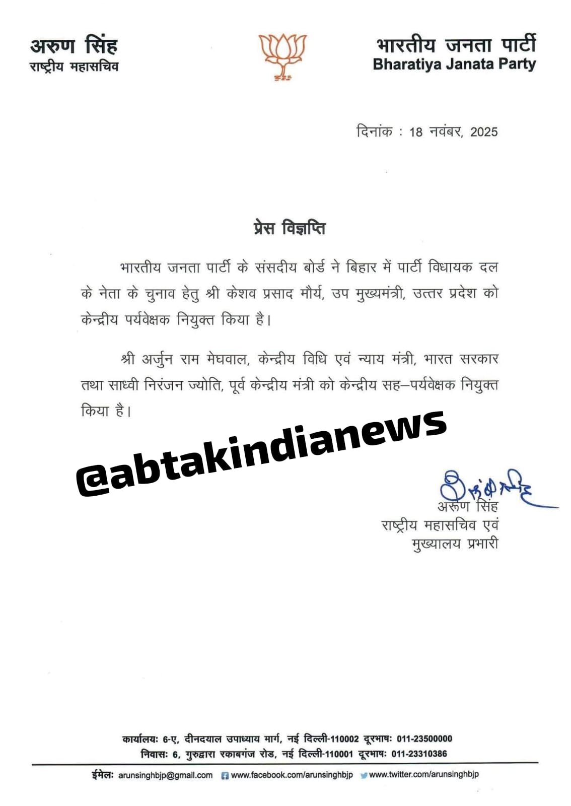 अबतक इंडिया न्यूज दिल्ली 18 नवंबर । बिहार में एनडीए की प्रचंड जीत के बाद के बाद अब भाजपा केंद्रीय नेतृत्व ने एक पर्यवेक्षक दल का गठन किया है।उत्तरप्रदेश के उप मुख्यमंत्री केशव प्रसाद मौर्य को केंद्रीय पर्यवेक्षक नियुक्त किया हैं।भाजपा राष्ट्रीय महासचिव द्वारा गठित पर्यवेक्षक दल में बीकानेर सांसद व केंद्रीय कानून मंत्री अर्जुनराम मेघवाल सहित पूर्व केंद्रीय मंत्री साध्वी निरंजन ज्योति को सह-पर्यवेक्षक नियुक्त किया हैं।केंद्रीय पर्यवेक्षक दल एनडीए विधायक दल का नेता चुनने की प्रक्रिया को अंजाम देंगे।