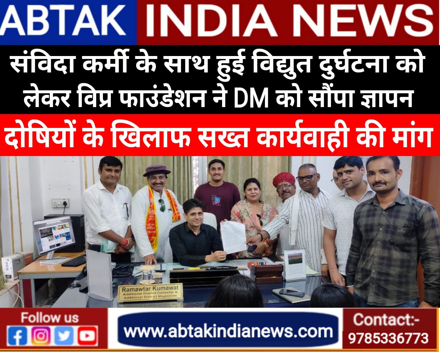 उदरासर जीएसएस पर संविदाकर्मी के साथ हुई विद्युत दुर्घटना को लेकर विप्र फाउंडेशन ने जिला कलेक्टर को सौंपा ज्ञापन, दोषियों के खिलाफ सख्त कार्यवाही की मांग